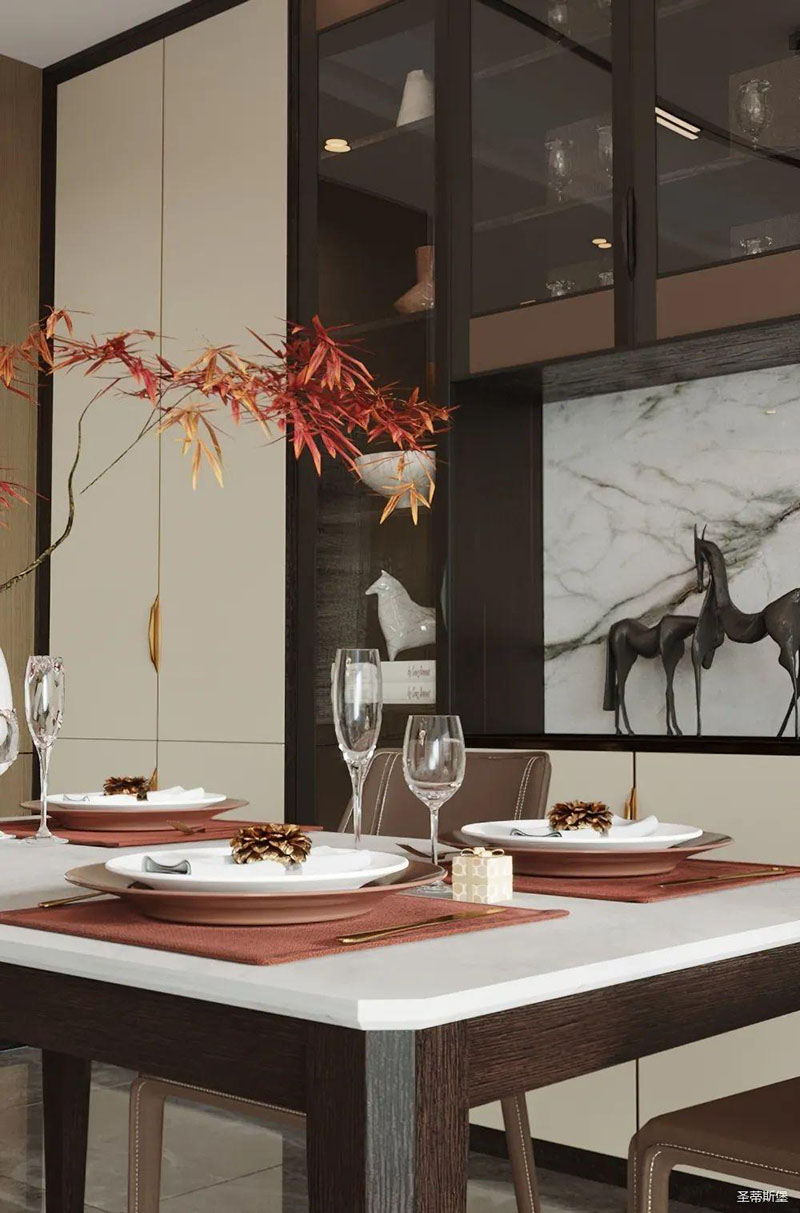 純美的線條,沉穩(wěn)的色澤,為空間定下了低調(diào)而華麗的基調(diào)。渾然天成的實(shí)木與巖板紋理,讓角幾蕩漾出一幅“水光瀲滟”的潑墨油畫。三兩紅枝點(diǎn)綴,表達(dá)著“枝頭并蒂祝吉祥”的美好祝愿。光影透過極簡(jiǎn)金屬幾腳,折射出一種隱藏的優(yōu)雅氣質(zhì)。大小、高低不一的天然材質(zhì)角幾組合在一起,時(shí)尚又個(gè)性,不僅便于移動(dòng),還表現(xiàn)的靈活且輕巧。