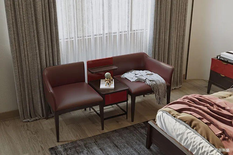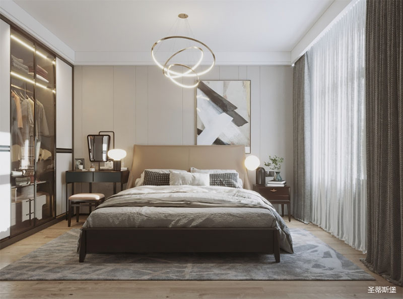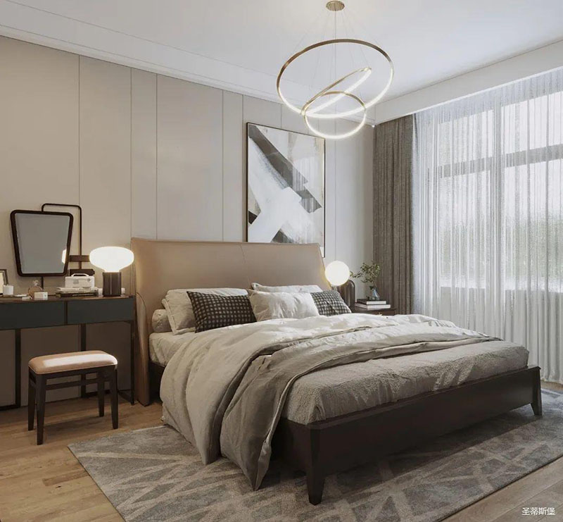 靈活變裝的主臥空間,自成獨(dú)特的設(shè)計(jì)語言與真摯的感情糅合。經(jīng)典意式極簡(jiǎn)軟床,流暢順滑的真皮床屏,賦予了空間溫馨高貴的氣息。酒紅實(shí)木質(zhì)感的床頭柜,整齊擺放,欲有“鴻運(yùn)當(dāng)頭”的美好寓意,塑造出一方簡(jiǎn)約知性的靈動(dòng)空間。