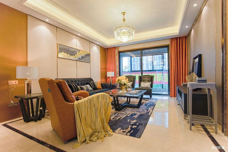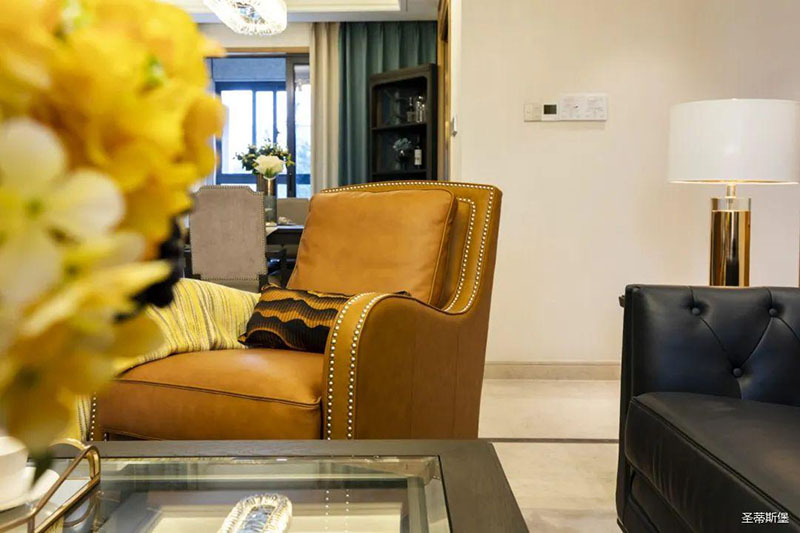 愛馬仕橙的休閑椅是空間的點(diǎn)睛之筆,相對(duì)于霸氣沉穩(wěn)的墨綠雙人沙發(fā),它更為時(shí)尚摩登,兩者合理搭配,賦予了空間陽剛與柔情并存的意境。