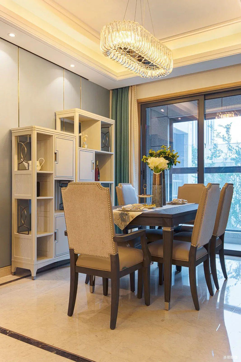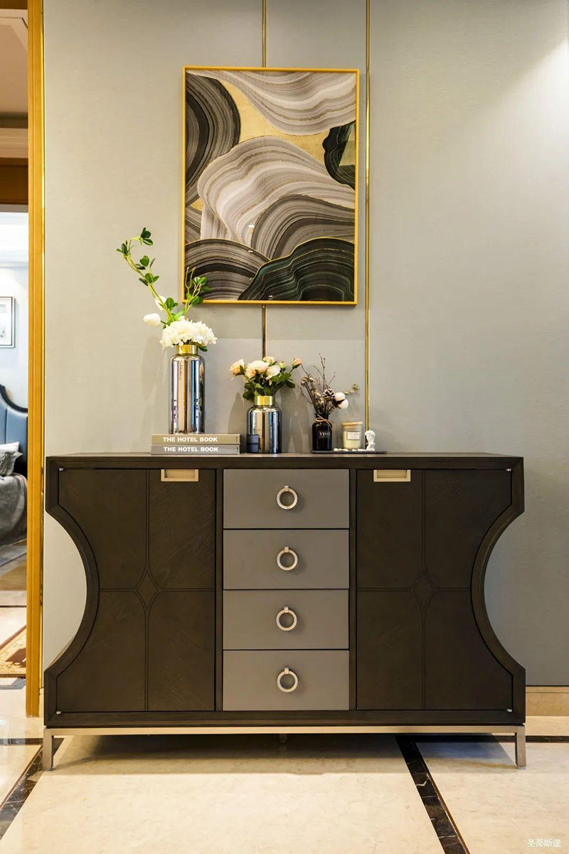 米白色餐邊柜坐落餐廳一角,簡約沿框線條,層次分明。金屬半圓與實(shí)木鑲嵌,盡顯優(yōu)雅輕奢的姿態(tài)。
