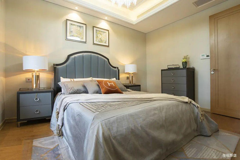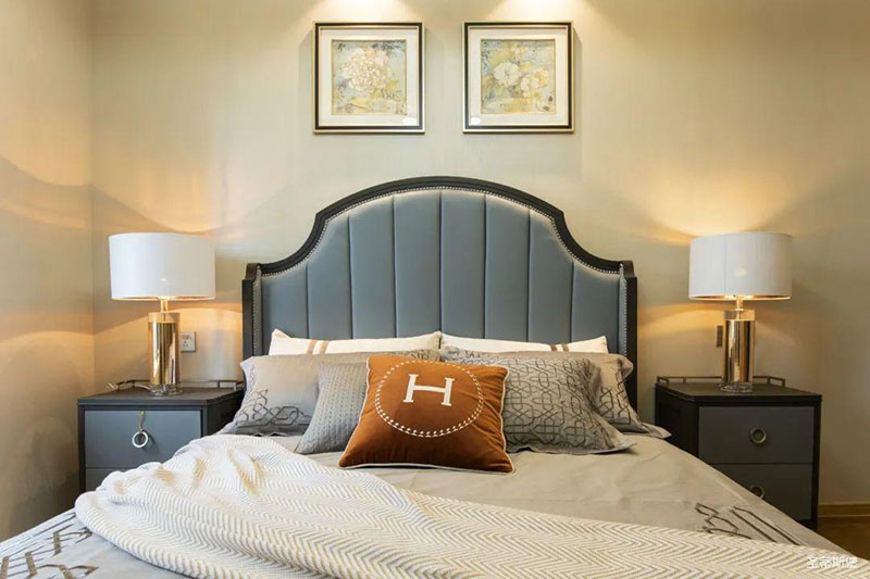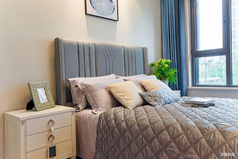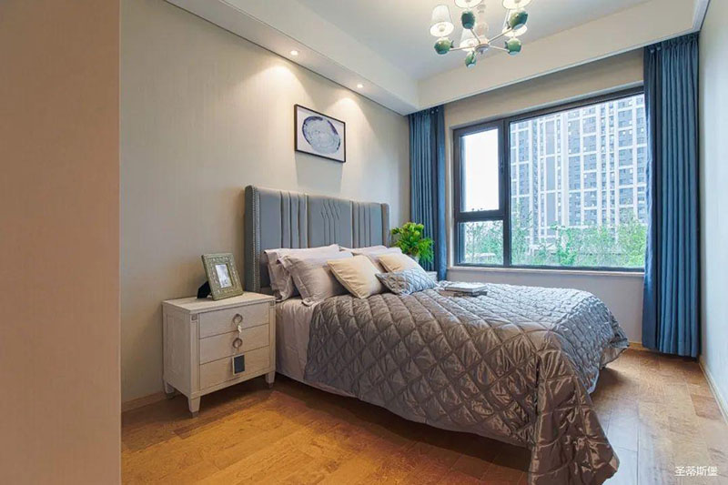 次臥高床屏由金屬鑲嵌,呈現(xiàn)簡約有序的線條,霧霾藍(lán)床屏與淺藍(lán)朦朧裝飾畫,窗簾相呼應(yīng),色澤搭配和諧自然,無不透漏著一種簡潔大方視覺體驗(yàn)。