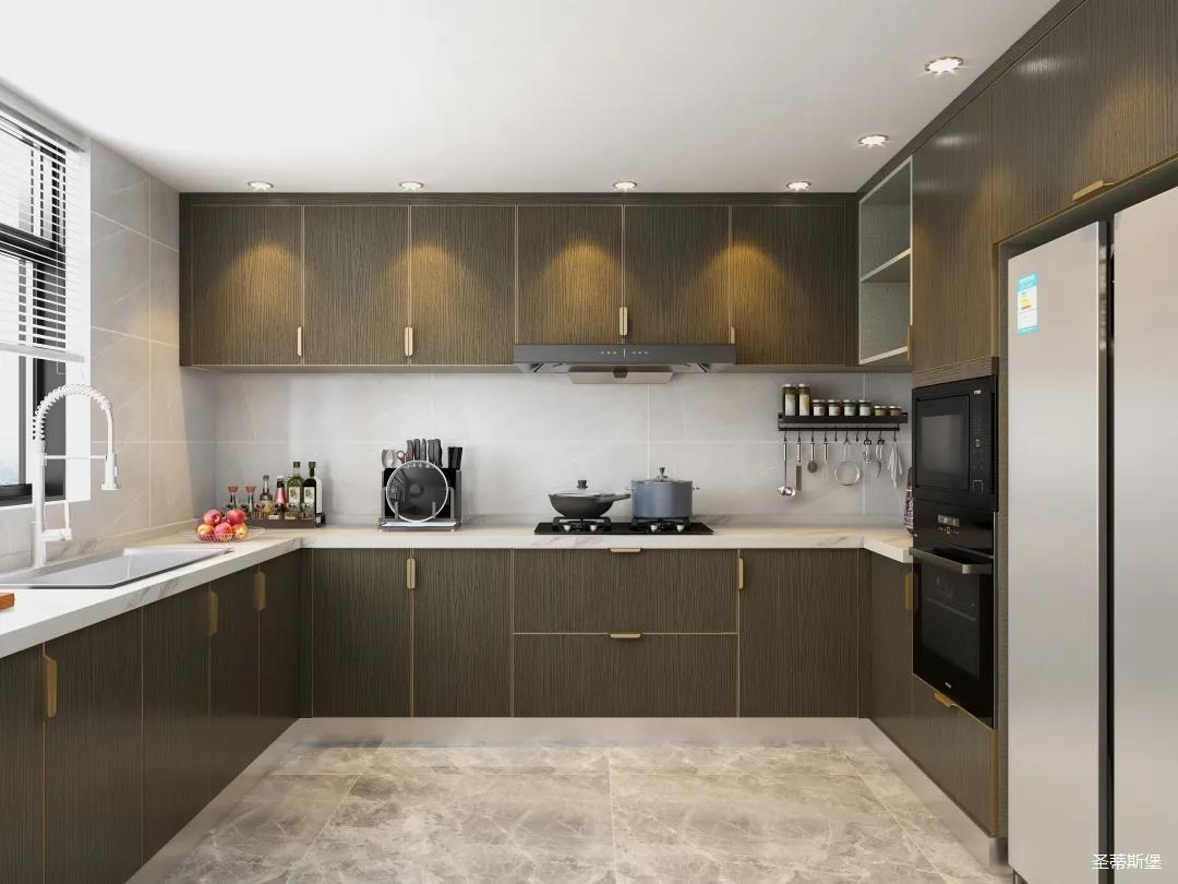 u型空間格局,設(shè)計師將功能區(qū)合理劃分,讓洗切煮一氣呵成。以米白水磨石+英倫爵士灰實木為主導的櫥柜系統(tǒng)中,人體工學流線,讓每一細節(jié)都折射出屋主對生活的考究,一廚一柜,每一處都關(guān)乎著我們對生活的熱忱。