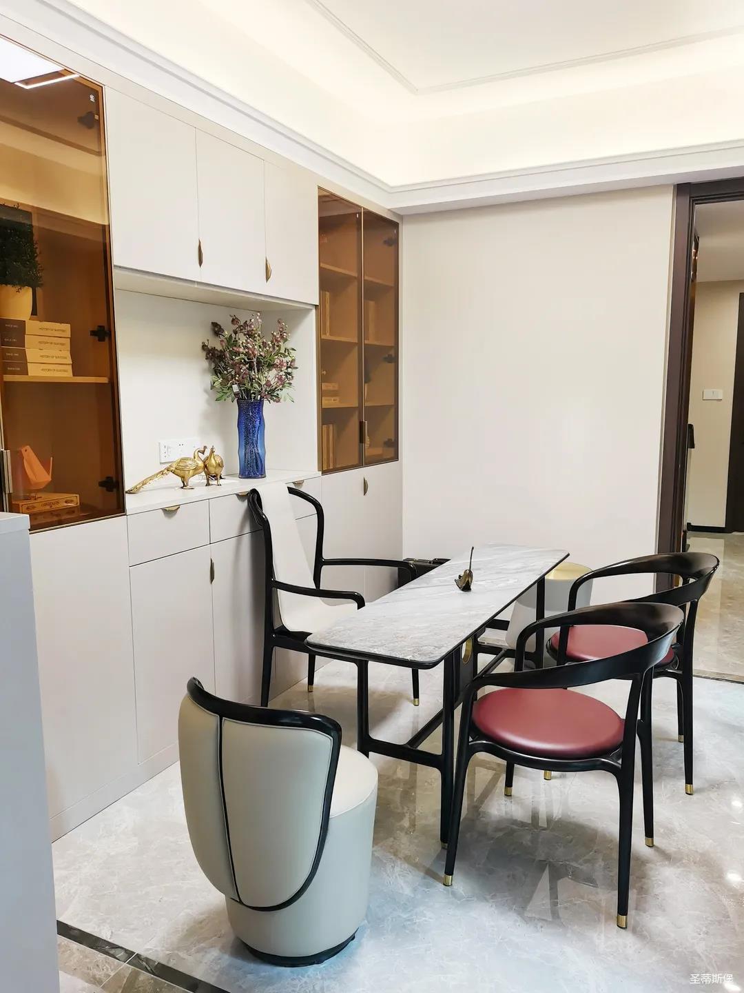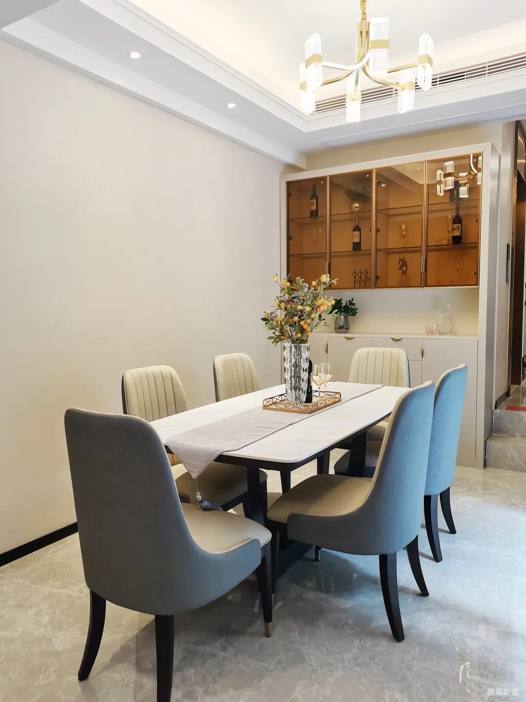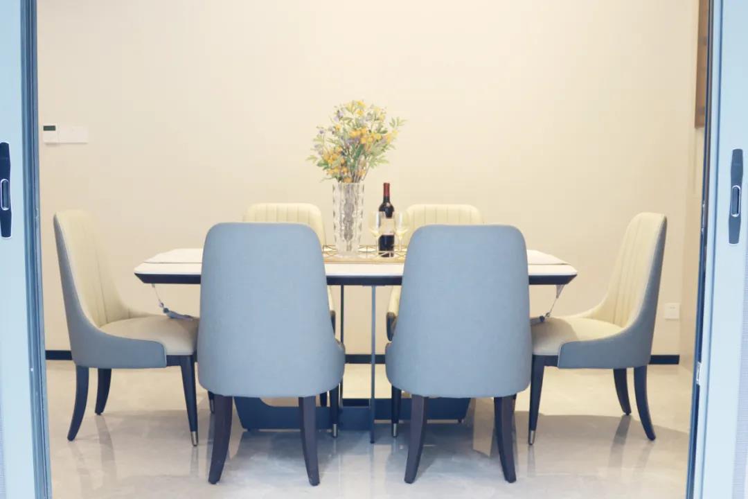 客餐廳雖屬同層,但由廊道隔開,各有寬闊的空間格局,加上引入自然光源的采光設(shè)計,空間通透明亮。巖板餐桌搭配的真皮餐椅,讓不同的材質(zhì)在在空間完美契合,既增加了空間的時尚氛圍,也能給人良好的用餐體驗(yàn)。
