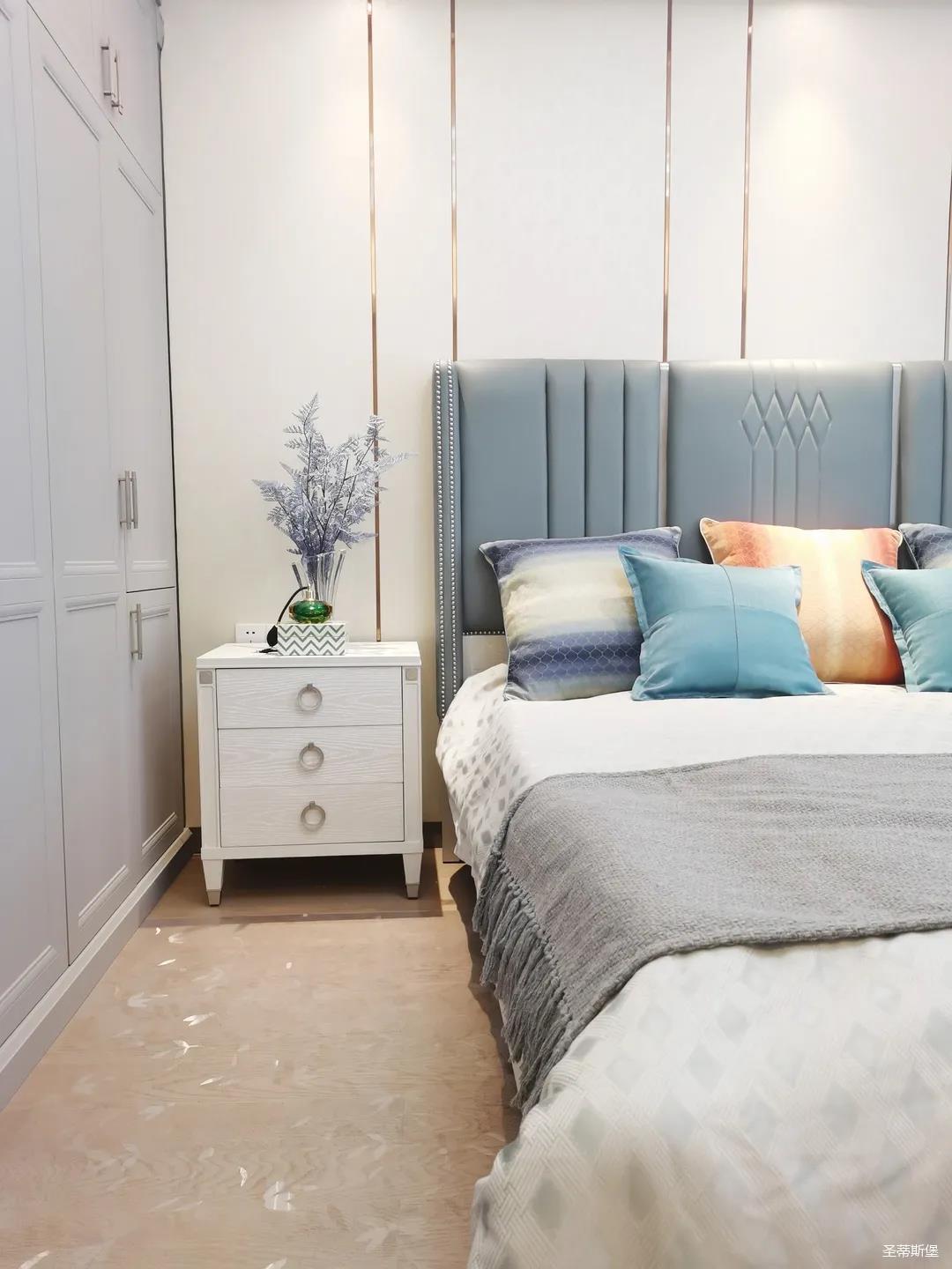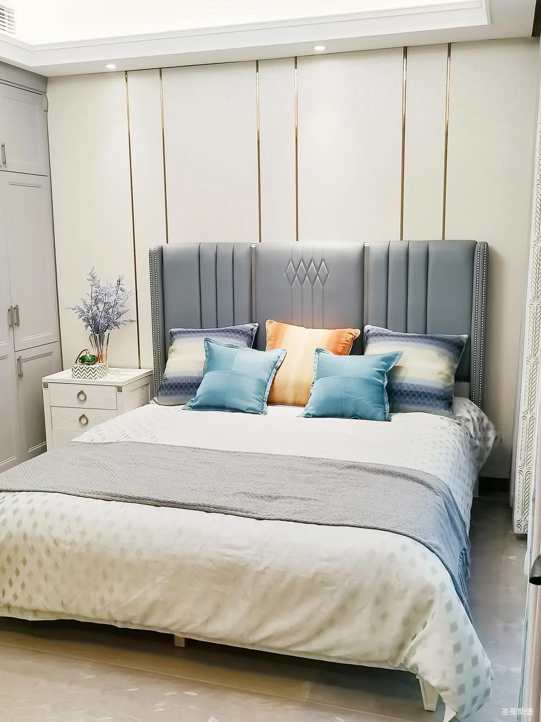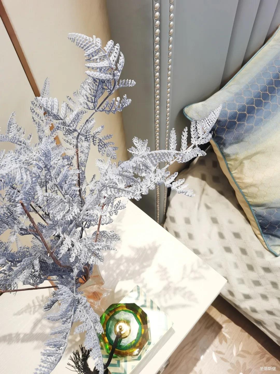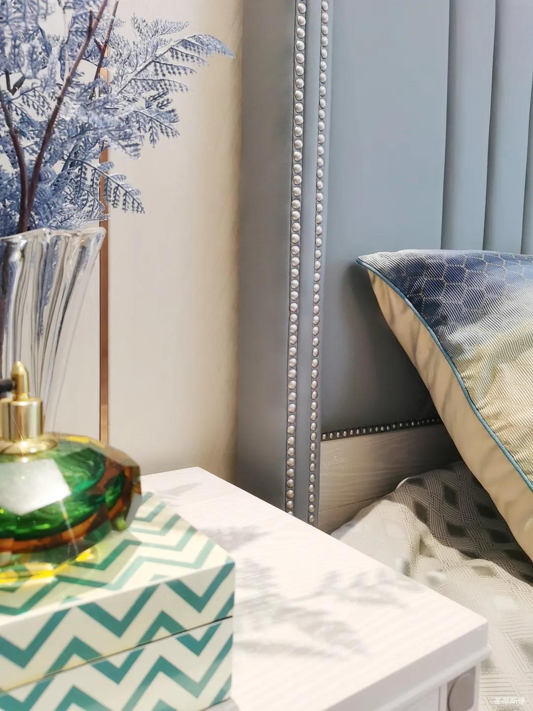 一樓的房間業(yè)主是作為長輩房,采用輕奢的背景墻面,結(jié)合亮眼的金屬線條設(shè)計,空間顯得時尚又不失沉穩(wěn)。莫蘭迪色的淺藍(lán)床屏,在無主燈設(shè)計與自然光線的碰撞下醞釀出不同的光影美感。
