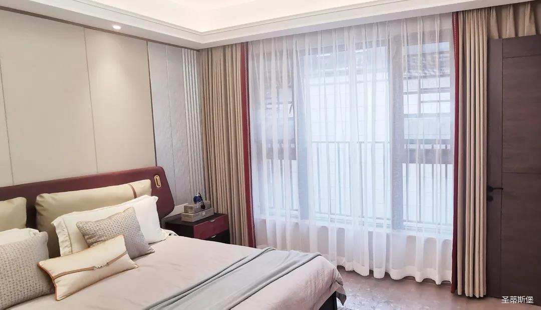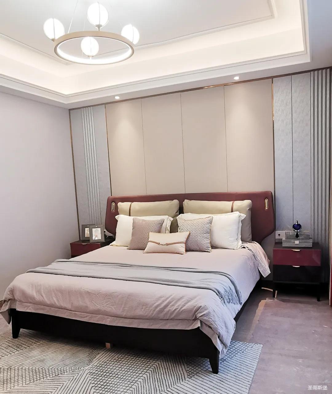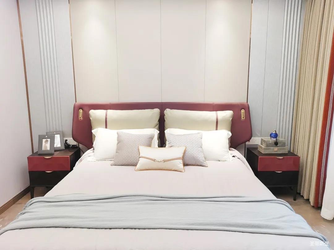 三樓的主人房設(shè)計風(fēng)格更偏向簡約,浪漫的酒紅色床屏運(yùn)用了曲面造型,融合了極簡主義美學(xué)和輕奢元素,小型夜間感應(yīng)燈設(shè)計讓每一處細(xì)節(jié)都充滿著時尚優(yōu)雅的氣息。夜間倚靠在厚實(shí)的軟包上,時光好像在不知不覺中慢了下來,讓我們能品味和咀嚼生活的氛圍。