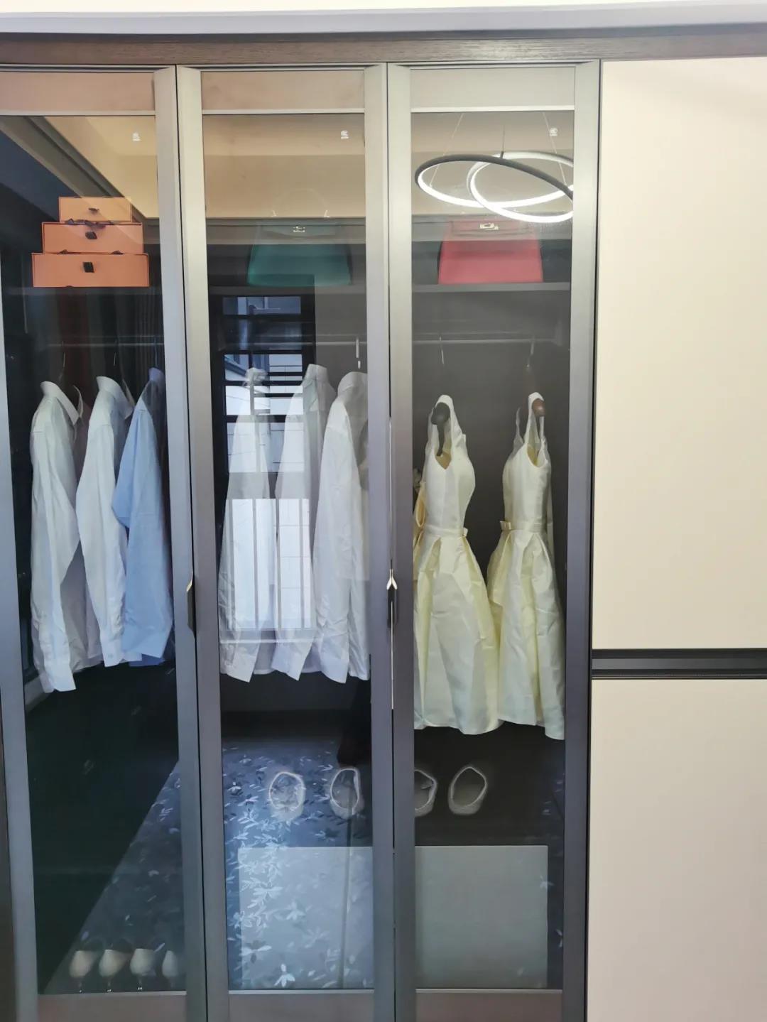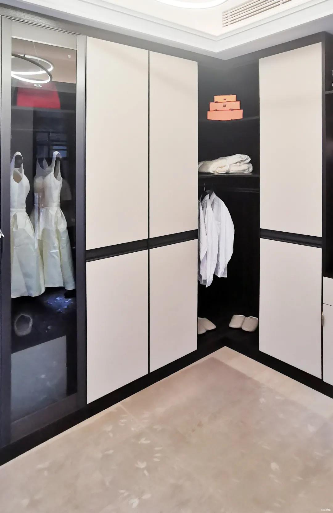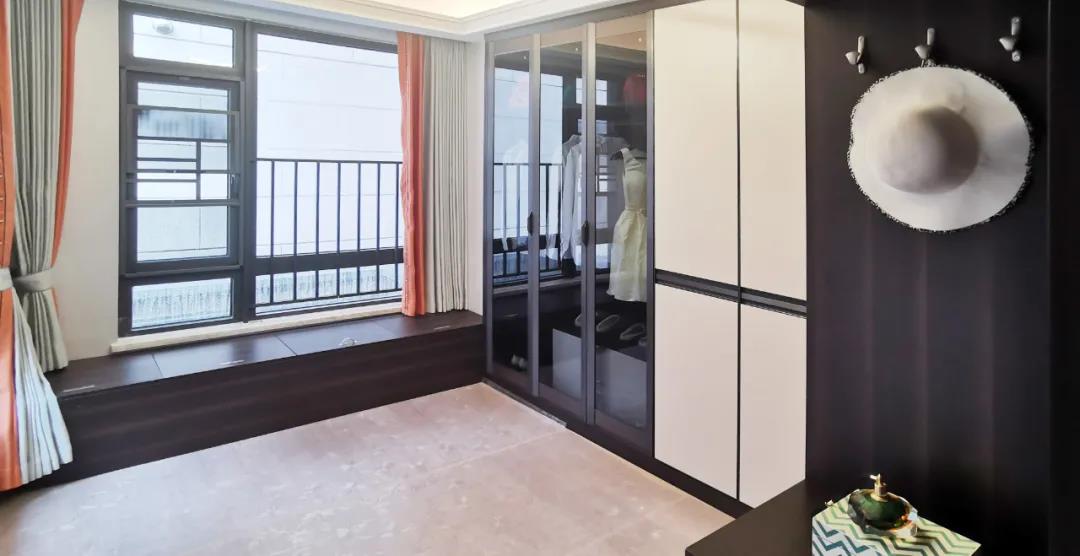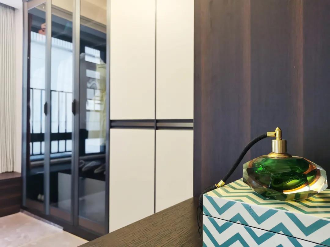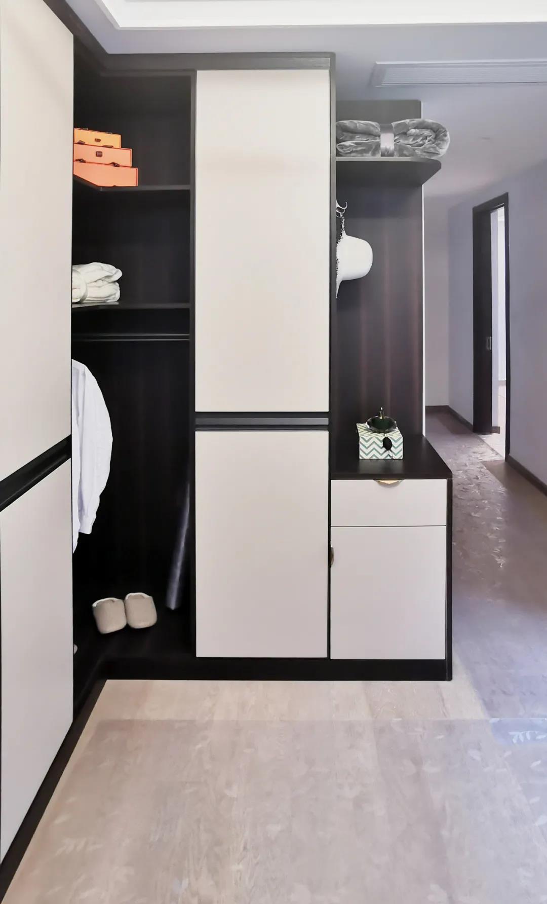衣帽間以現(xiàn)代極簡設(shè)計手法引入輕奢元素,借助實(shí)木與金屬組合打破了傳統(tǒng)儲物區(qū)的沉悶感,煙熏色橡木紋的定制柜體,色澤好似一杯溫暖醇香的摩卡,令空間層次感與立體感的格調(diào)頓生,予以沉穩(wěn)舒適感官體驗(yàn)。