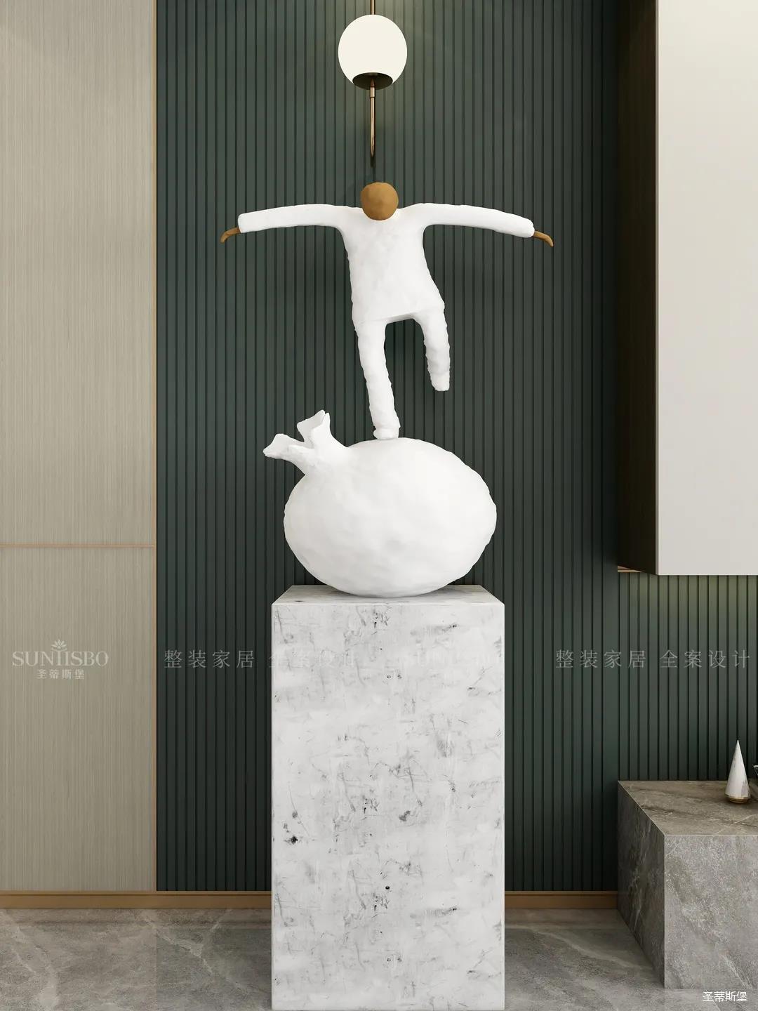 白綠搭配作為當下時尚界的黑馬,一個沉著冷靜,一個高級清新,相互碰撞出前所未有的視覺享受。純白異型藝術雕塑是室內(nèi)和諧的體現(xiàn),也讓空間洋溢著趣味性。