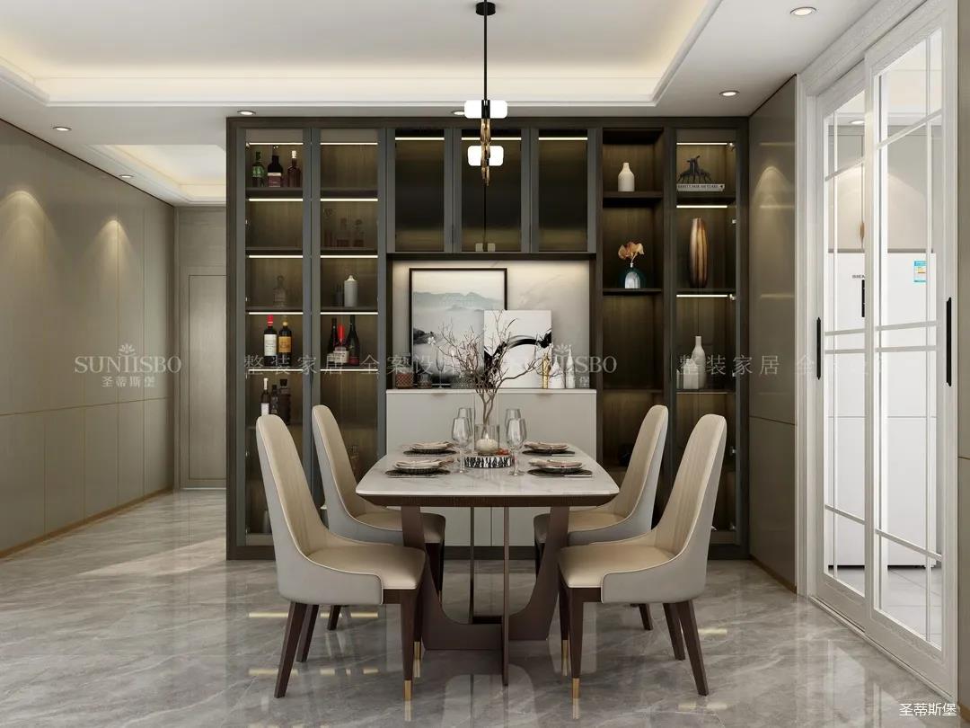 餐廳全開放式的布局,遵循了家具收納的28原則,20%的封閉式儲納,收納不常用的雜亂物品,80%的半開放設計,展示軟裝飾物。餐邊柜將玻璃、金屬、實木材質(zhì)糅合分配,讓空間質(zhì)感倍增的同時,也讓用餐空間多了一份家的溫度。