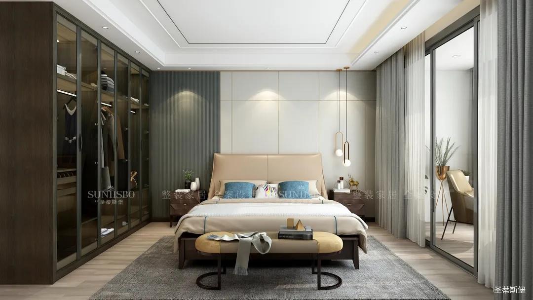主臥運用了大面積落地窗圍合,整體的無主燈設計,凸顯了空間極簡潮流。無限引入窗外的移動光線,輕松為空間注入陽光的溫度,u型極簡金屬懸置著一個白色造型燈,讓空間從靜謐中生出無窮的變幻。家具設計偏向簡約舒適,造型雖不奪目,但細節(jié)質(zhì)感卻能經(jīng)得起時光的琢磨與品味。