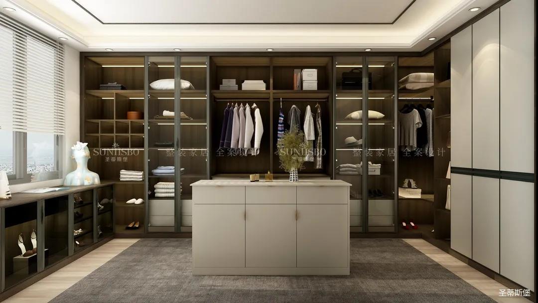 衣帽間采用了虛實結合的設計,構筑起規(guī)整而有序的置物區(qū)域和功能齊全的收納系統(tǒng),煙熏色實木作為空間的主要元素,環(huán)抱著整個衣帽間,張揚又不失沉穩(wěn),恰到好處地搭配金屬玻璃置頂高門和感應燈光系統(tǒng),挑高了空間效果,也詮釋著現(xiàn)代極簡線條美感和對極致的生活追求。