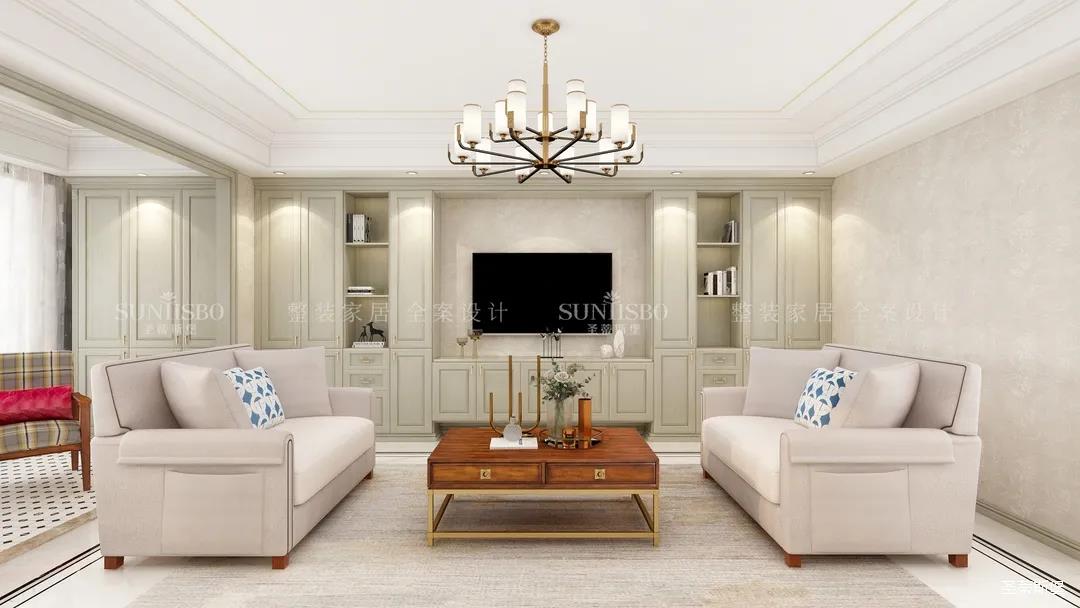 它以英倫爵士灰為柜體主調(diào),背景墻定制了整墻的儲物柜,色調(diào)懷舊復(fù)古的同時還夾帶著時尚摩登氣息,明暗收納合理分區(qū),電視被實木飾面包圍,使空間視覺得以延伸,美觀收納兩不誤。