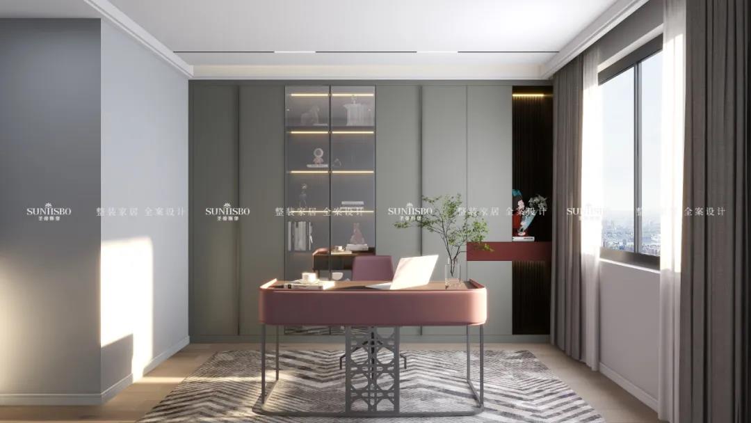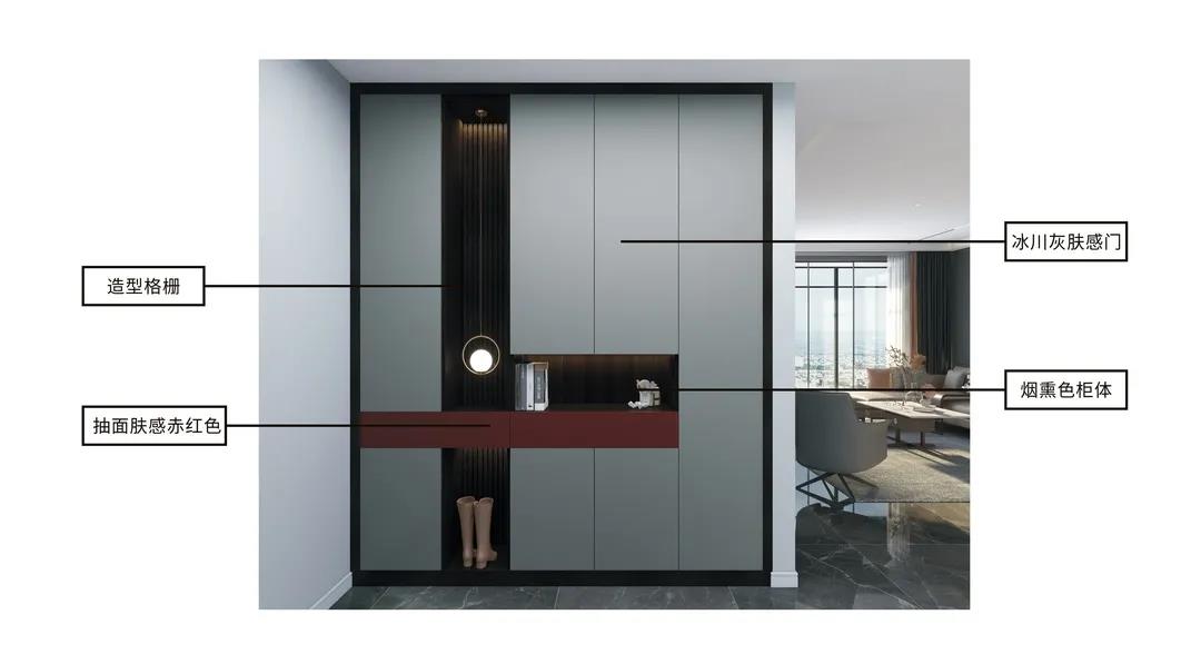 灰色平板門和煙熏色柜體做深淺搭配,搭配深灰鋁框門,整體簡單又大氣,再點綴一抹赤紅色,點亮了整個空間。