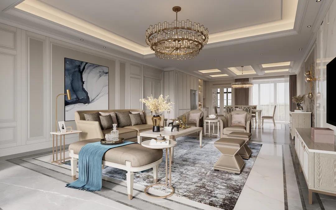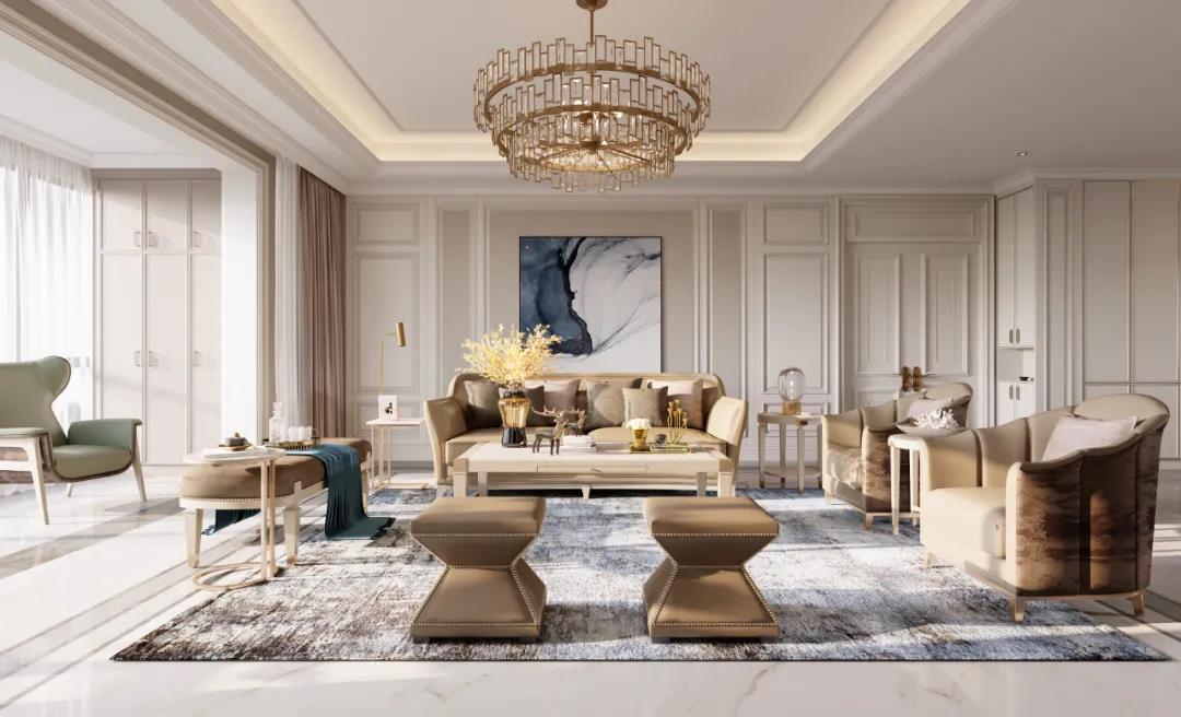 本案定位美式輕奢風(fēng)格,設(shè)計師提取了業(yè)主喜歡的顏色添加至空間中,并運用金屬元素滲透到每一個空間,統(tǒng)一色調(diào)。在設(shè)計上,格局大而不空,以優(yōu)美線條雕琢空間語言,材質(zhì)肌理間的碰撞融合,打造出層次豐富的藝術(shù)感。