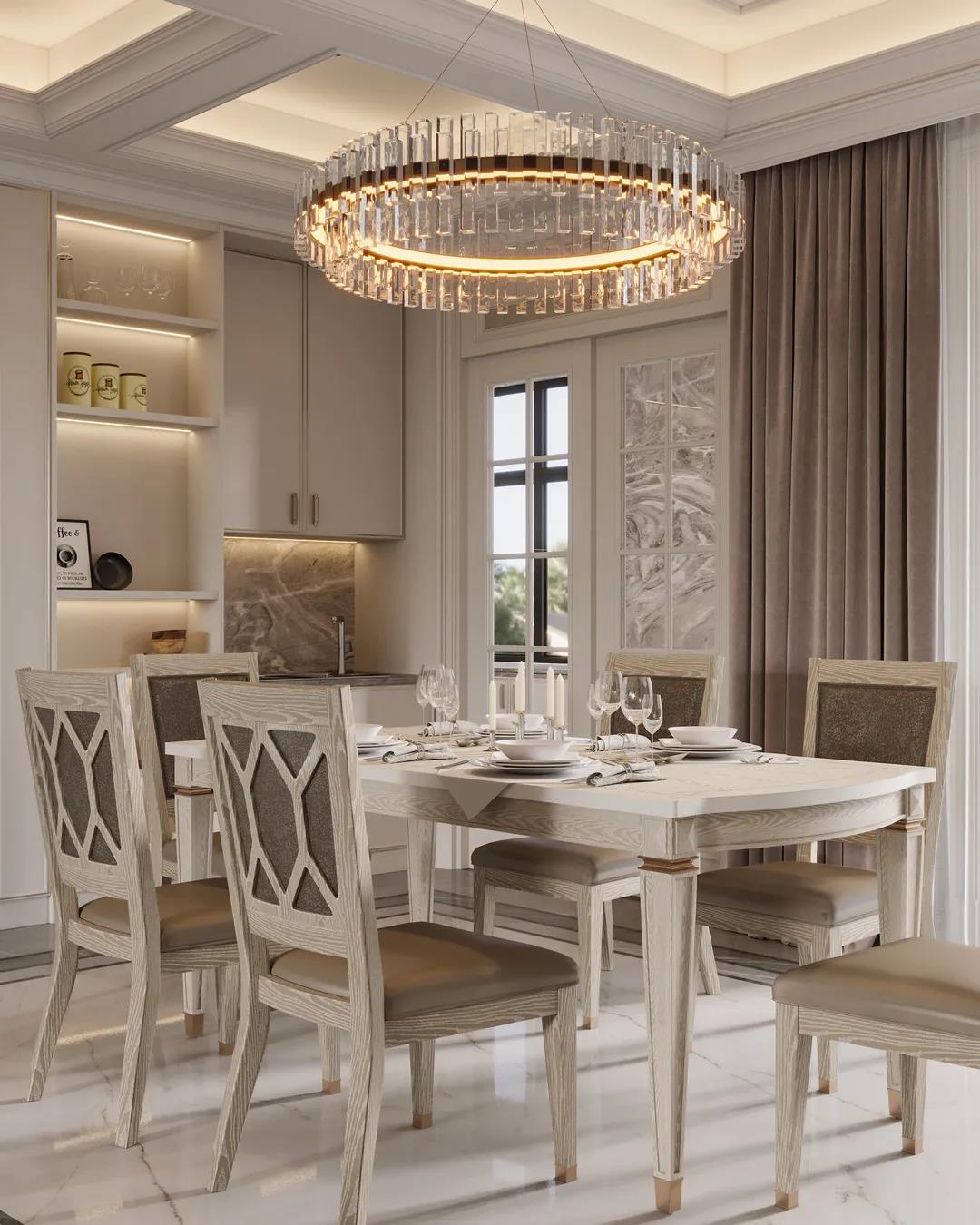 在華麗而精致的餐廳中,仿古白的餐桌椅搭配通透的水晶高腳杯,兩者交相輝映,用餐儀式感十足。墻面的護墻板和酒柜呈現(xiàn)一字型設(shè)計,一方面增添空間整體的豐盈感,還強調(diào)出個性現(xiàn)代的輕奢布局。