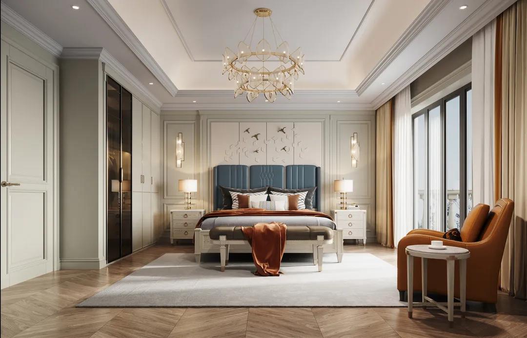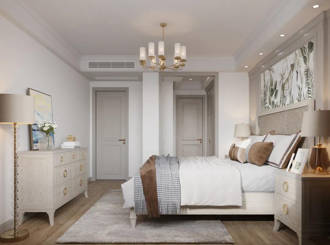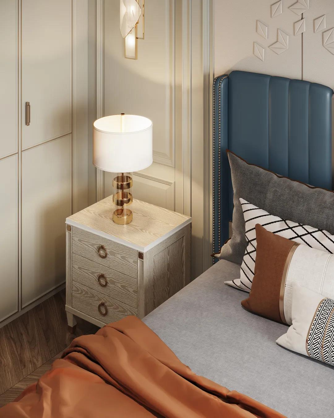 主臥以線條元素做主導(dǎo),軟包的床頭墻面充滿安全感,浮雕的造型給空間布局帶來了極佳的層次感,以現(xiàn)代美式輕奢框架為主題,融入了美式靈動的線條,讓整個臥室既有時尚質(zhì)感,又有時光打磨后的穩(wěn)重。